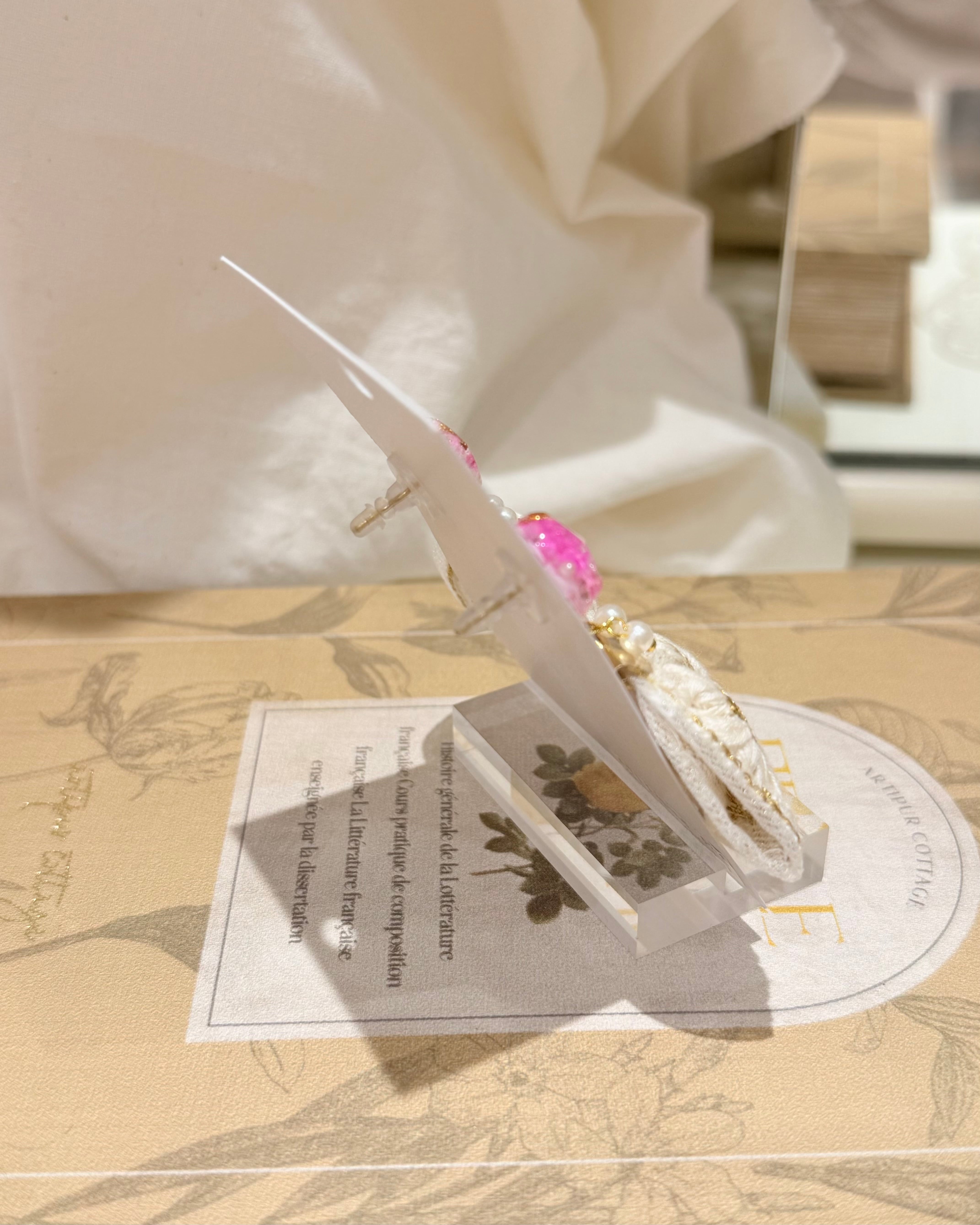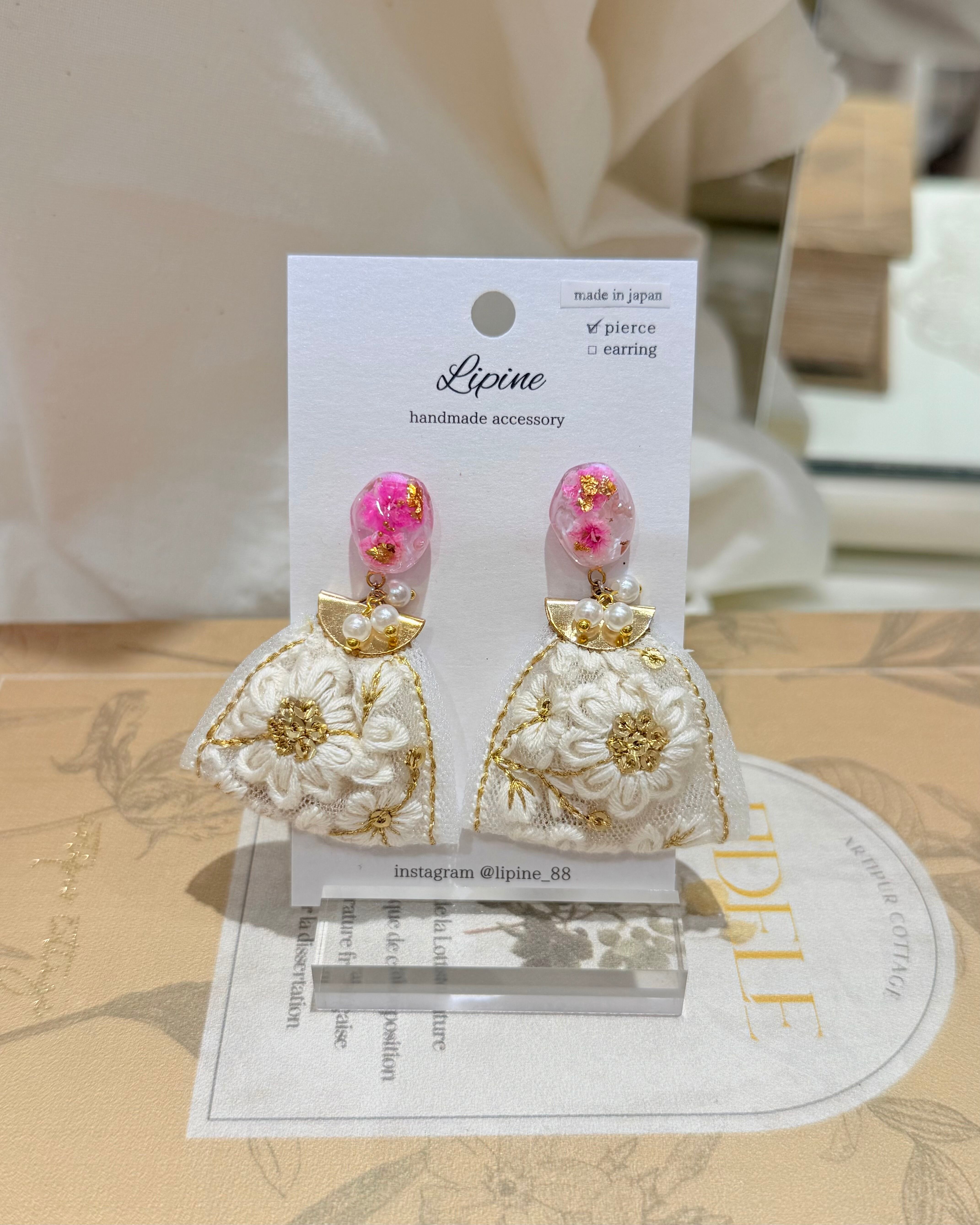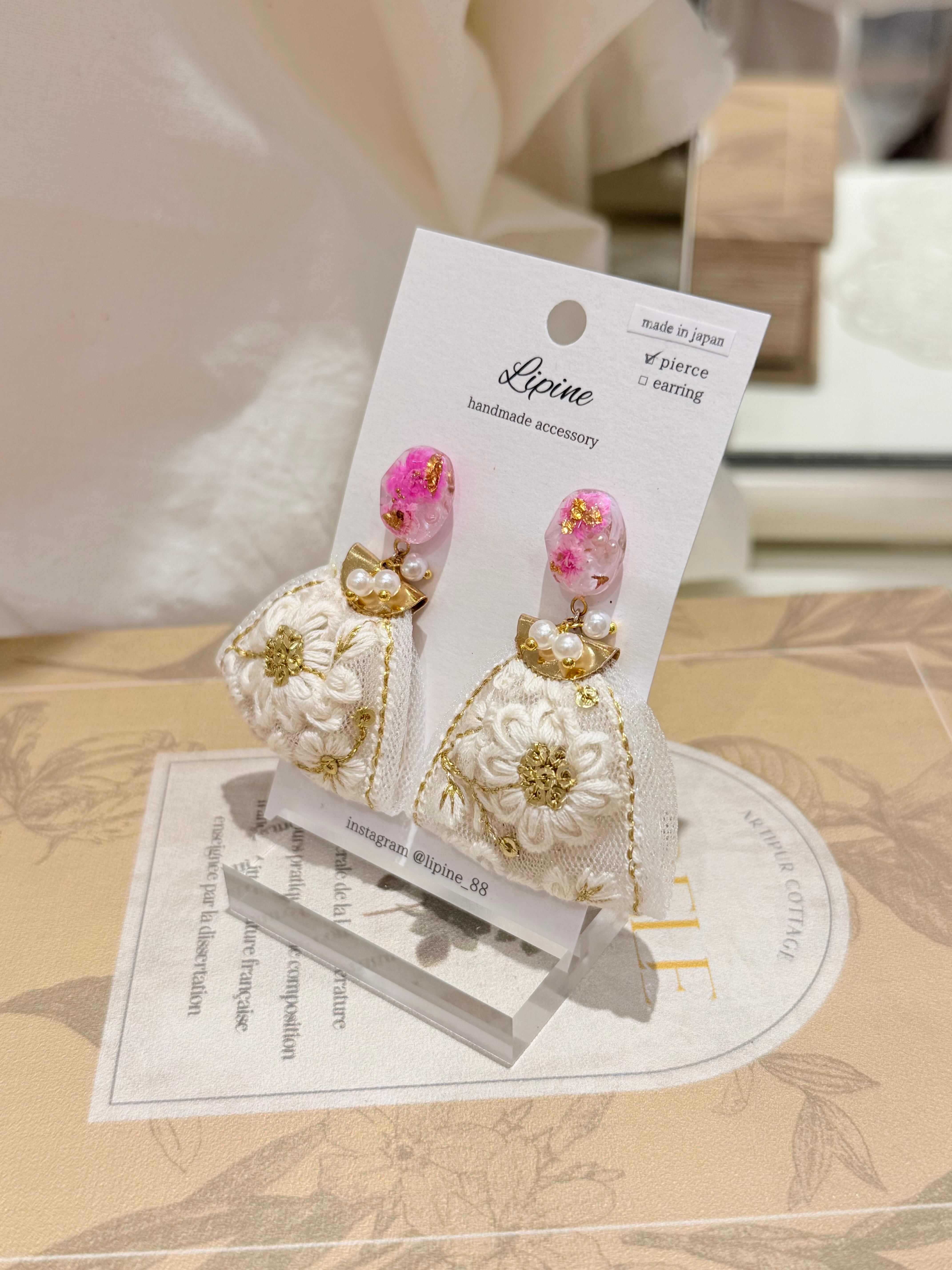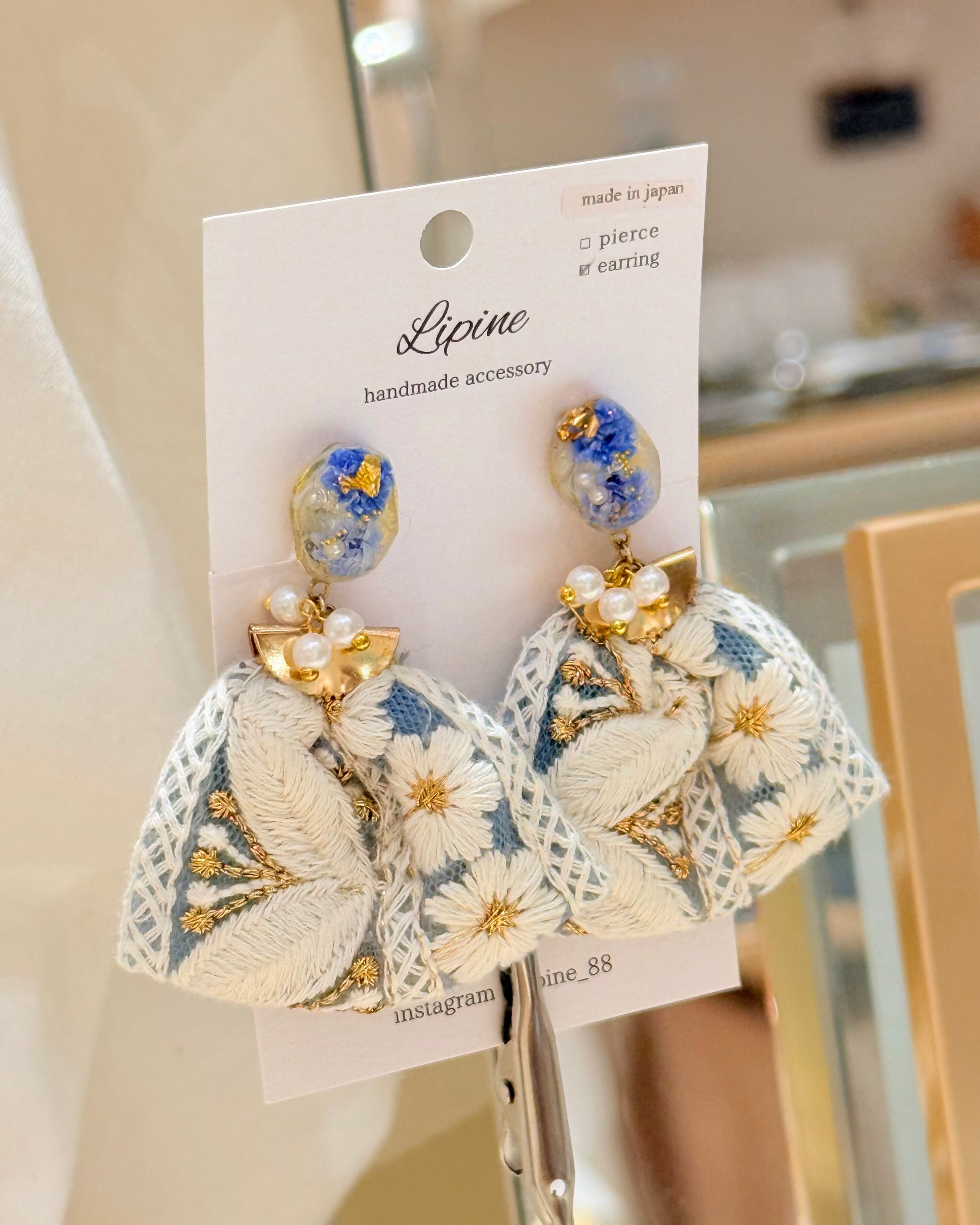 繊細な刺繍生地と異素材パーツを組み合わせたアクセサリー。