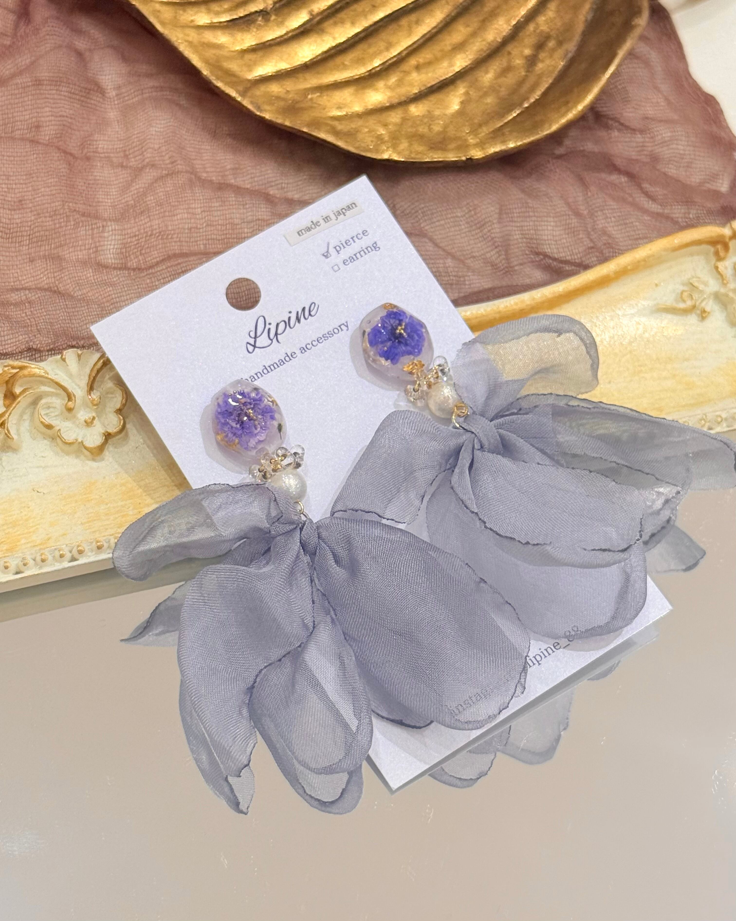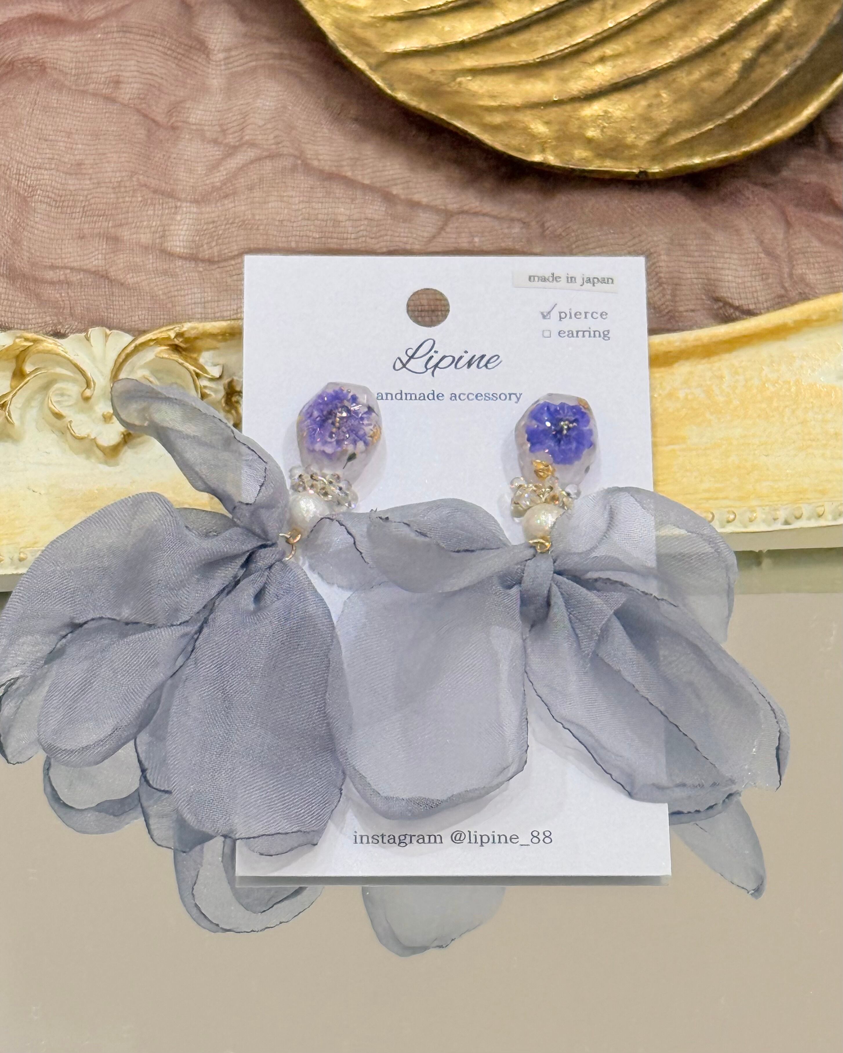ふんわりとした透け感のある生地と、表情豊かなパーツを組み合わせたアクセサリー。