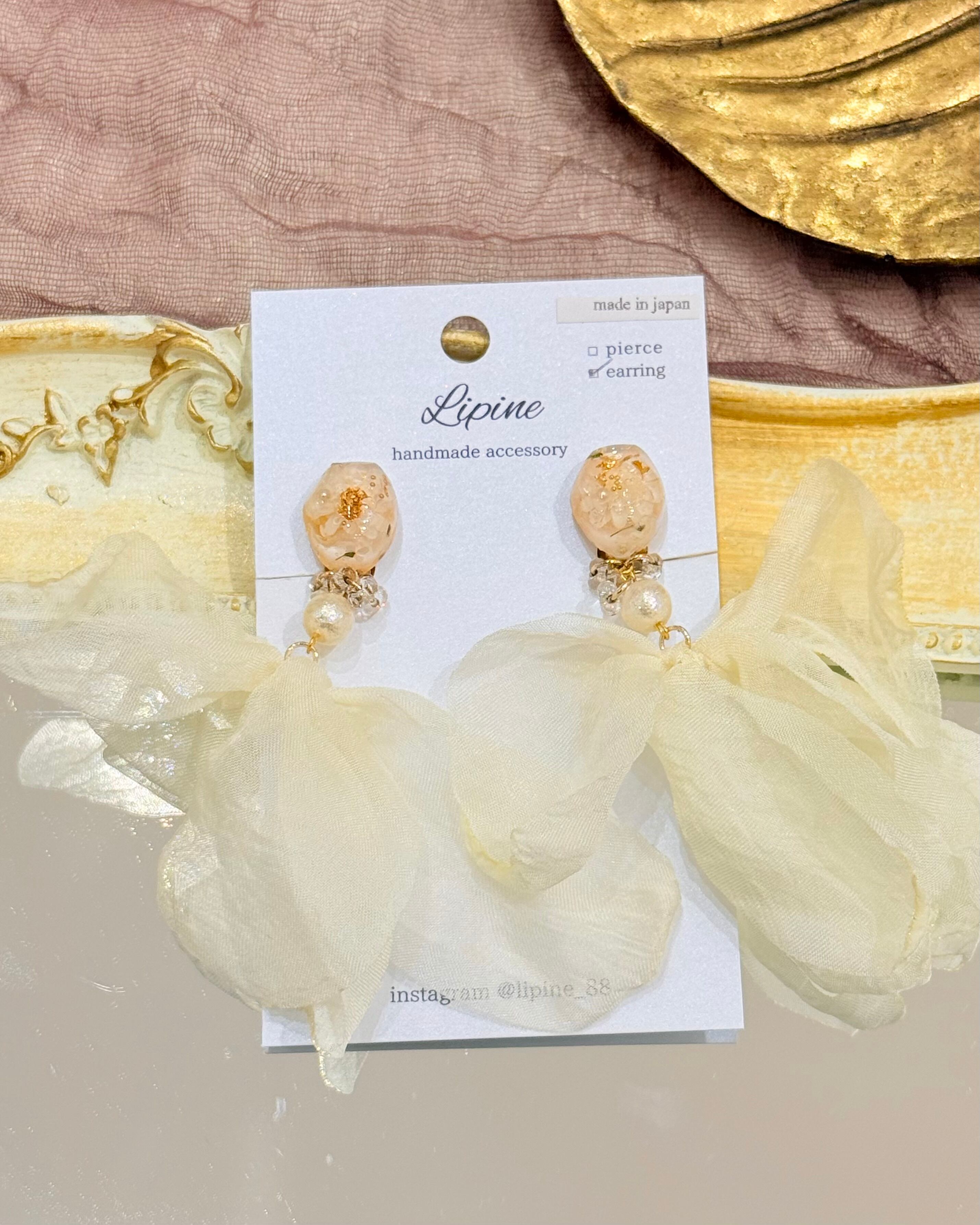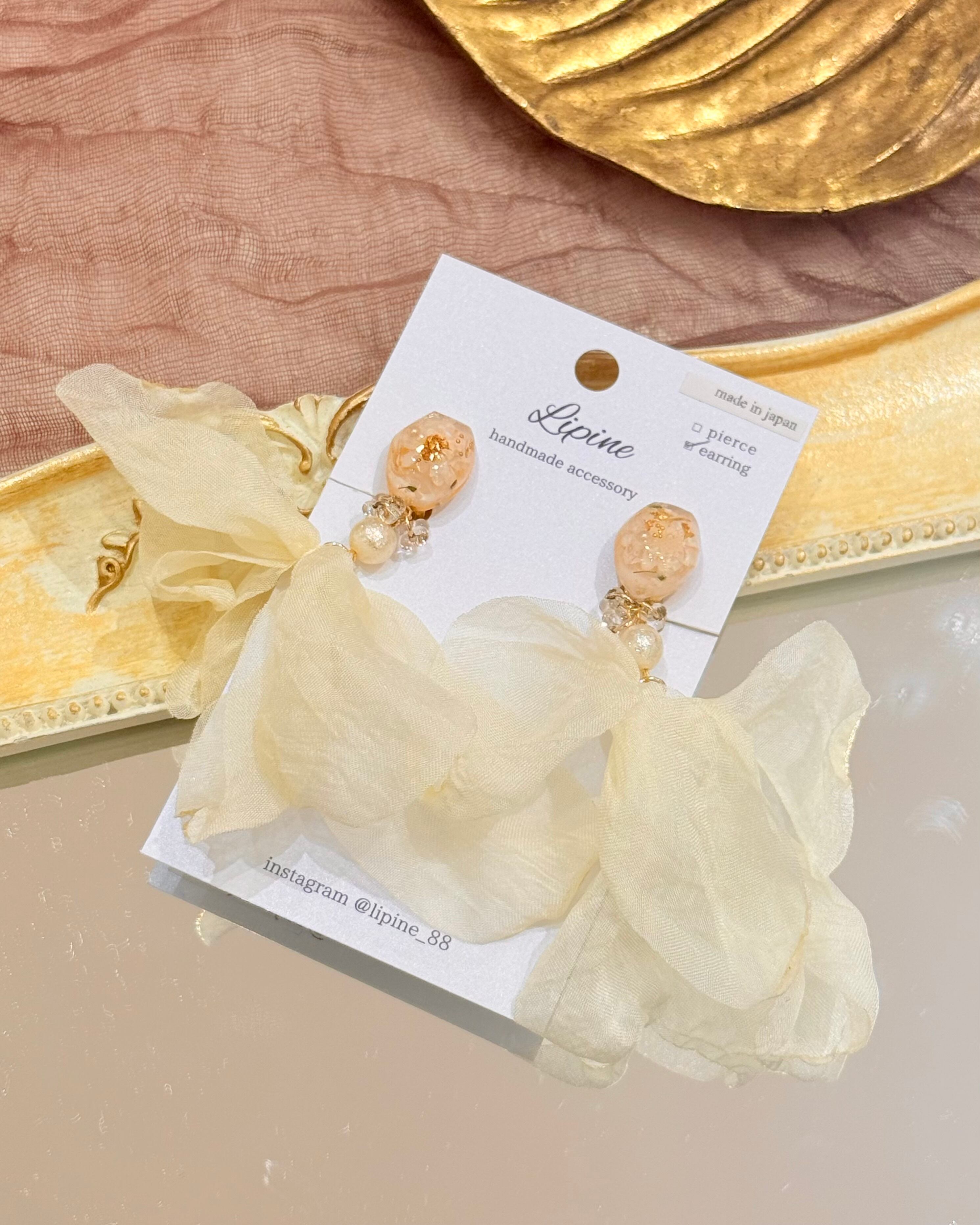 ふんわりとした透け感のある生地と、表情豊かなパーツを組み合わせたアクセサリー。